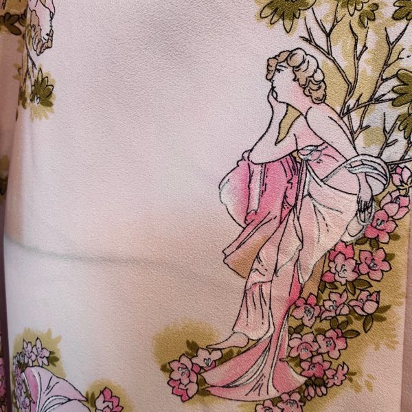 Such a pretty feminine maxi hostess dress. It is in the loveliest shade of baby pink & features the iconic 70’s does Edwardian fabric design. I’m rather obsessed with 1970’s novelty print fabrics that mimic the Edwardian / Deco eras. This dress does not disappoint!