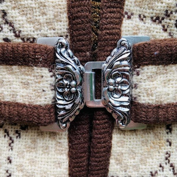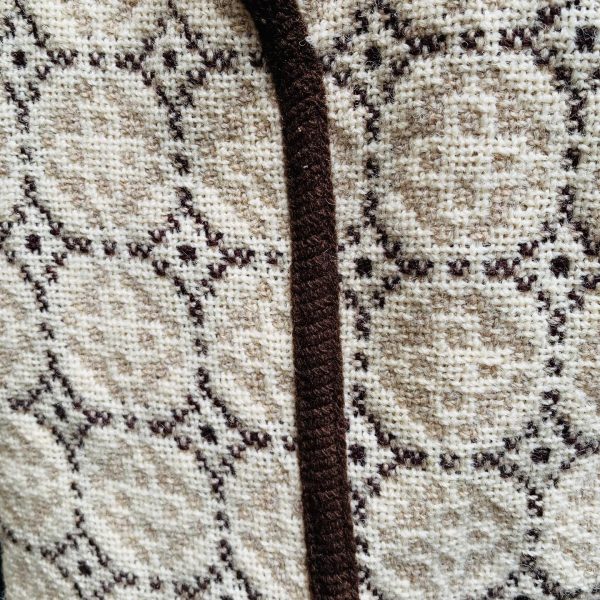 Chocolate brown, tan & cream with a lovely elaborate silver clip. Very traditional Welsh design. The vest also has pockets.